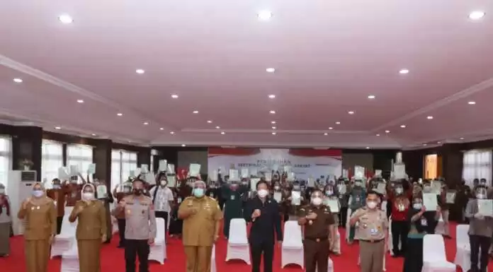 Menteri Agraria dan Tata Ruang/Badan Pertanahan Nasional (ATR/BPR) Sofyan Djalil dalam sambutannya mengungkapkan, pembagian sertifikat tanah adalah bagian dari stimulus dalam rangka meningkatkan ekonomi masyarakat di tengah pandemi Covid-19. Karena dengan sertifikat masyarakat berkesempatan mendapatkan akses permodalan, di samping adanya kepastian hukum atas tanah mereka.